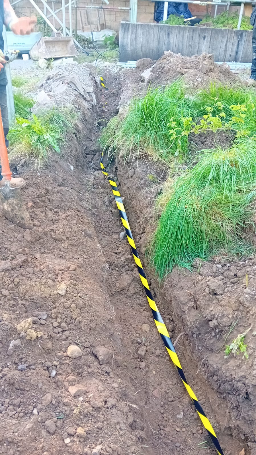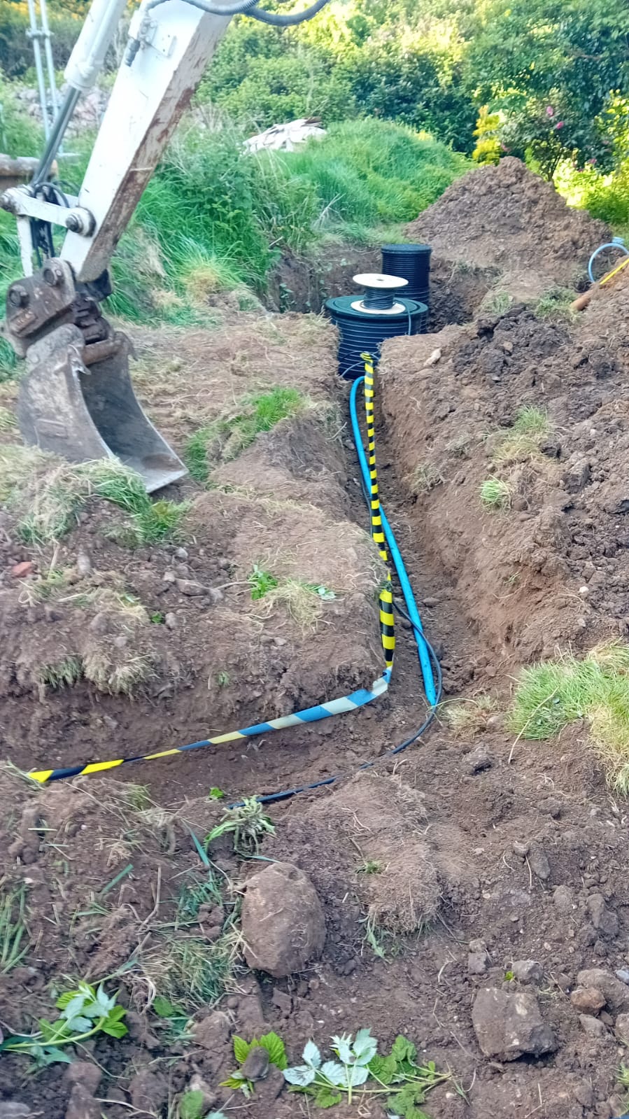 The air compressor was relocated three metres behind the tree line into a beehive housing, with all electrical cables and hose connectors placed in a watertight chamber. Topsoil was graded carefully over excavation areas, with eight tonnes of additional soil imported to create a level, stable site. Electrical cables were joined using resin-sealed scotch cast joints, and the aeration hose was fully replaced to eliminate joints, ensuring optimal nutrient processing in the STP.